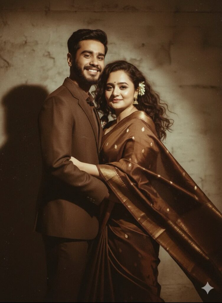 Create a retro vintage grainy but bright mage of the reference picture but draped in perfect brown Pinteresty aesthetic retro saree for girl and suite for boy. It must feel like a 90s movie brown hair baddie with A small ower tuck visibly in the curls and windy environment romanticising for girl. The girl nd boy is standing against a solid wall deep shadows and contrast drama, creating a hysterious and artistic atmosphere.