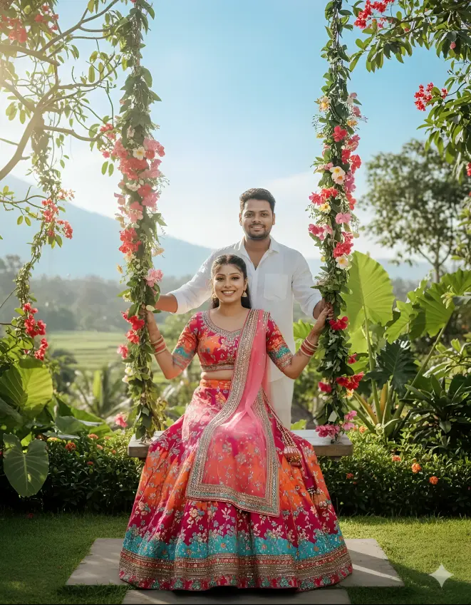 A beautiful romantic couple photoshoot in a luxury Bali resort garden. Behind them a breathtaking Bali nature view with flowers and greenery. A decorative floral swing is placed, the girl wearing a gorgeous colorful lehenga is sitting on the swing smiling happily. The boy in a stylish white shirt and pants is standing behind, gently pushing the swing. Bright natural lighting, cinematic photography, dreamy vacation vibes, vibrant colors, realistic and elegant style.